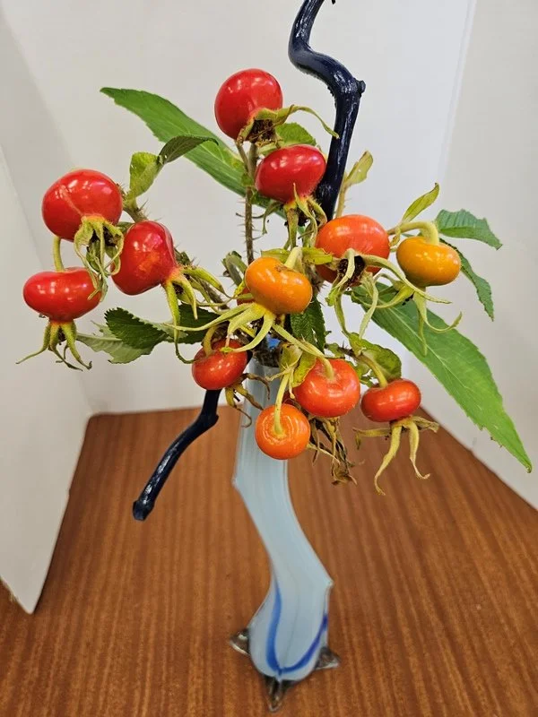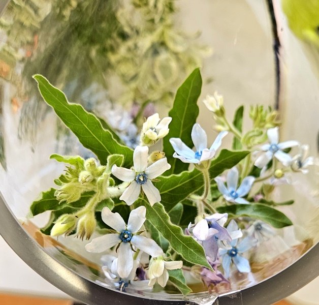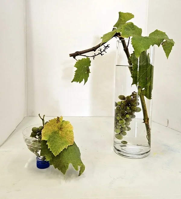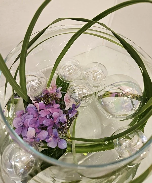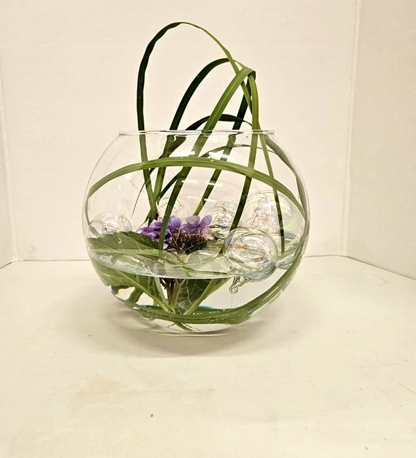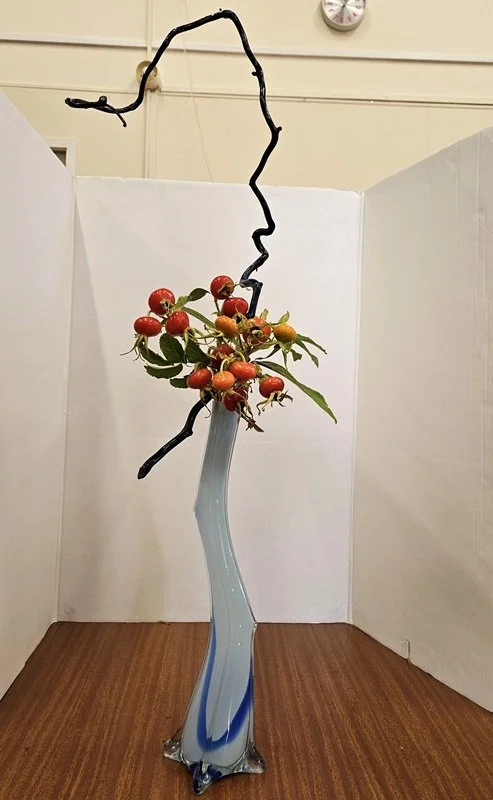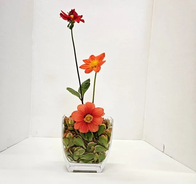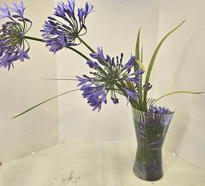 Glass containers allow us to emphasize the stalks as well as flowers. The positioning of what can be seen in the water should add interest to your composition. Do not use kenzan in your arrangements.