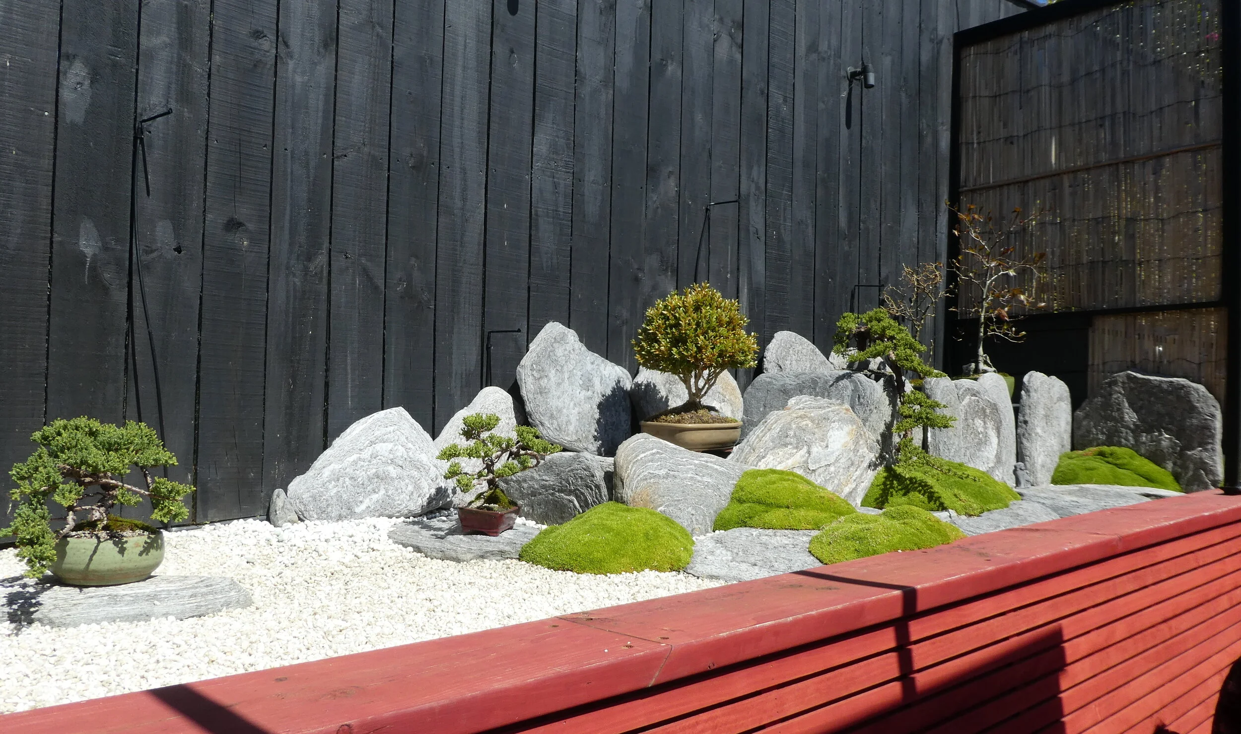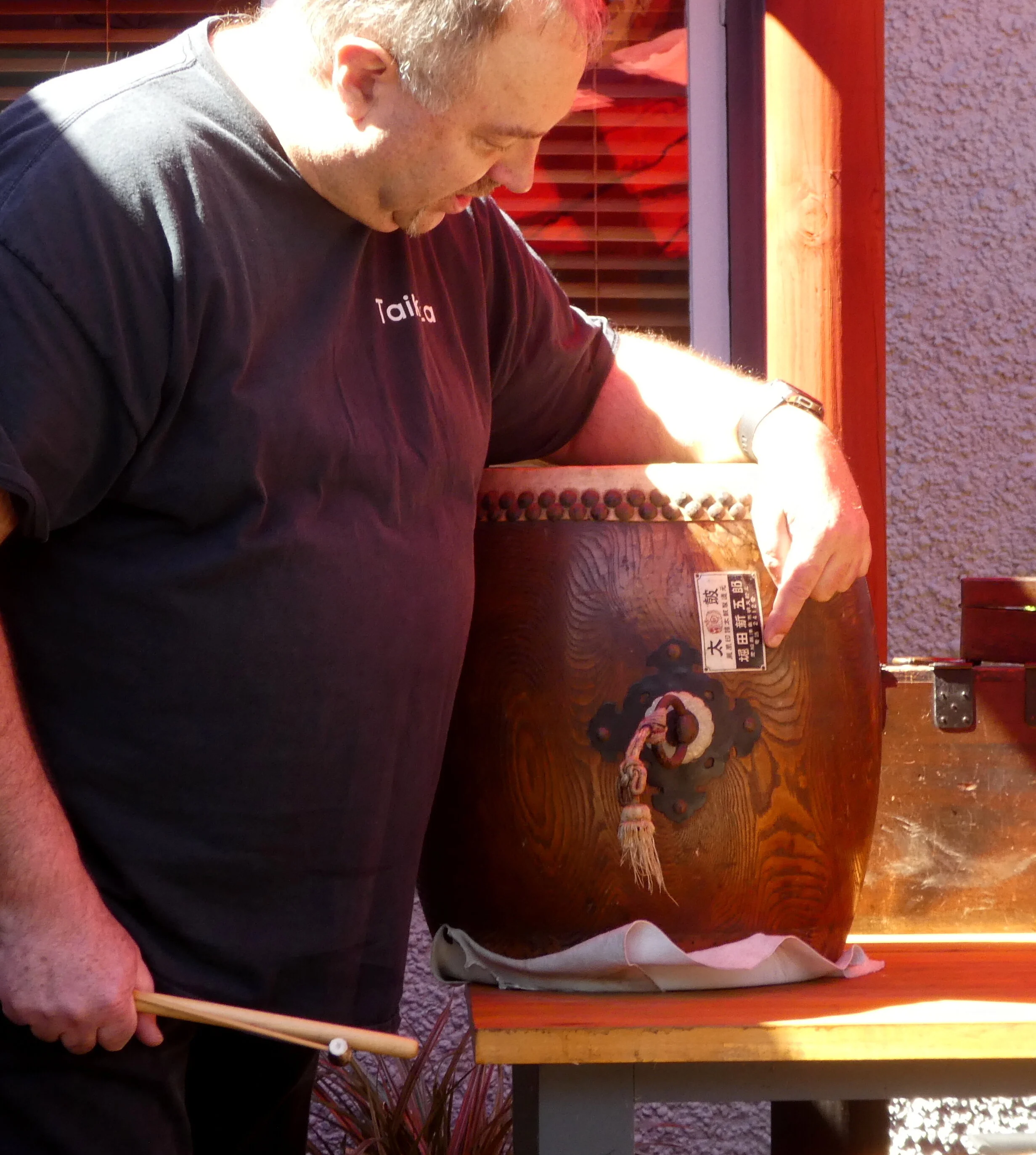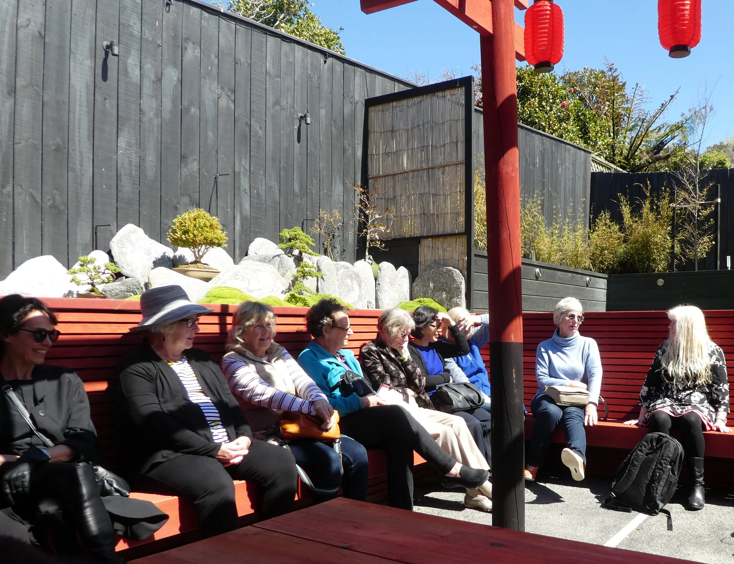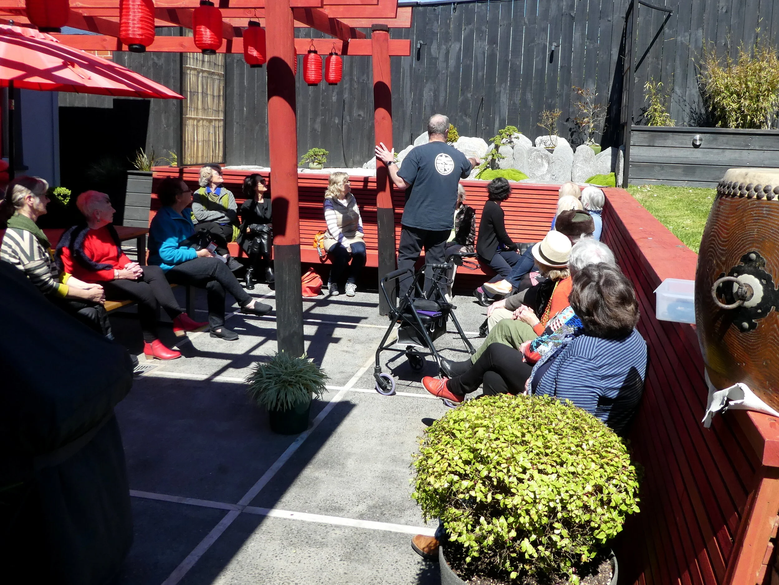 This month, instead of our usual workshop we visited a private Japanese style garden in Karori. We were lead around the back of Carl’s house where we were invited to sit under and around the outside of a red and black torii pergola. Hanging from it were Japanese lanterns and beneath them was a large red umbrella. Carl explained how he and his wife had designed and built their Japanese-like backyard and how they tend to the beautiful Zen garden with bonsai trees and ornaments. Carl is a taiko drummer and he explained and showed us how the drums are played.