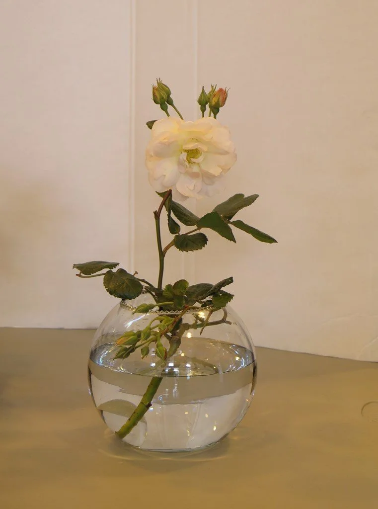 Maria used one garden rose in a glass container