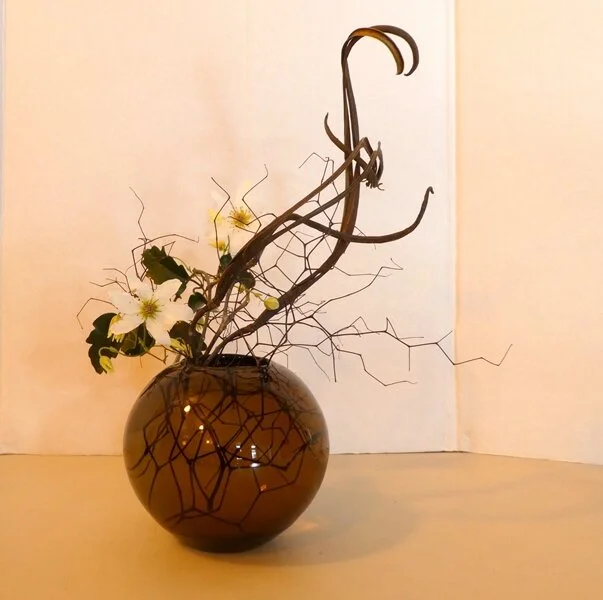 Clematis and dry material in brown glass vase