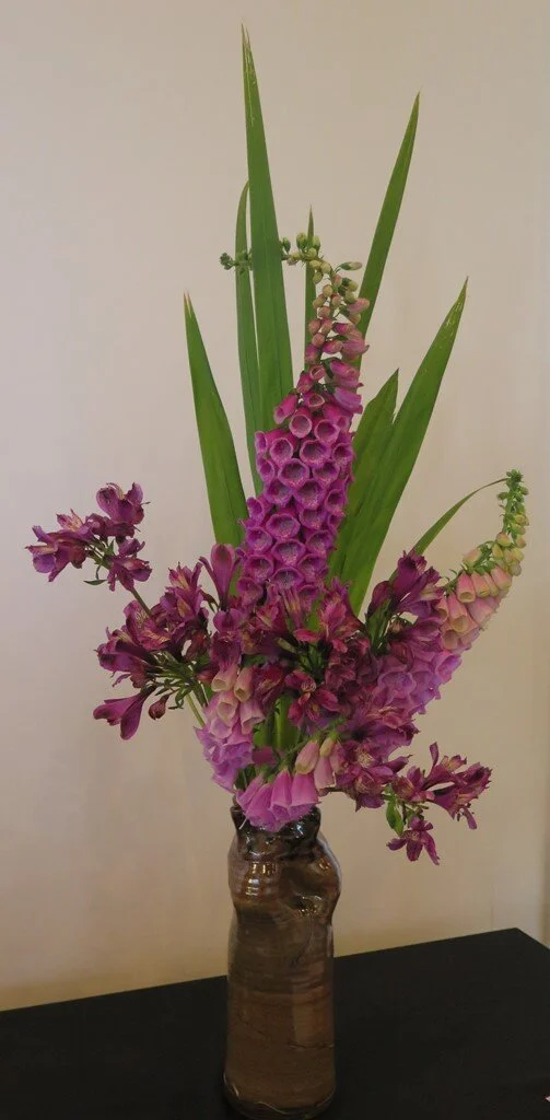Elizabeth created two arrangements from flowers from her garden……Sweet Peas and Agapanthus buds in a traditional Japanese basket, and purple toned Foxgloves and Alstroemerias in a nageire vase. Kathy’s arrangement featured new flax flower heads which echoed the yellow of her stunning sunflowers, while Adriana’s arrangement featured orange Gerberas, yellow alstroemerias and maple. These arrangements were all displayed on black tablecloths with our Sogetsu banner on the white background wall.