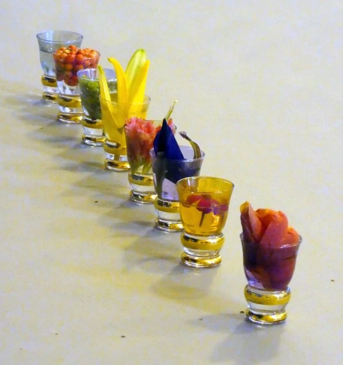 Lyn arranging a variety of material in small glasses