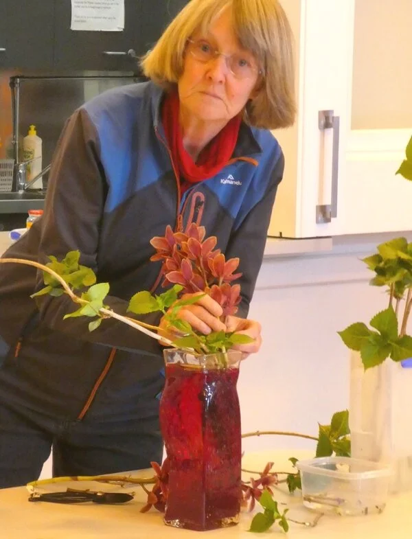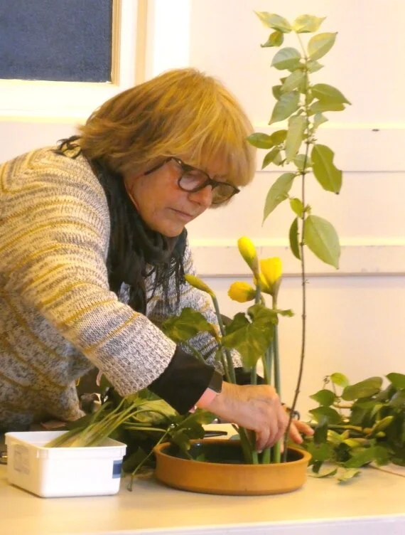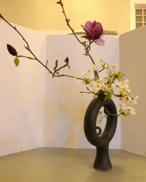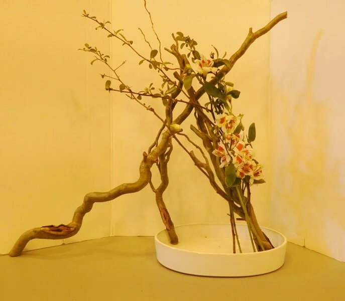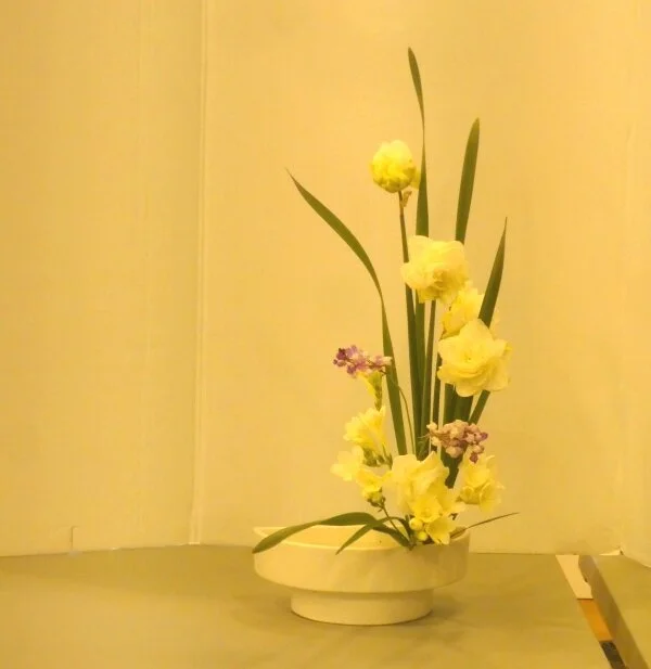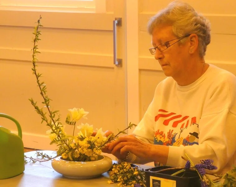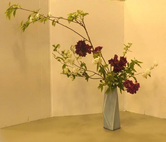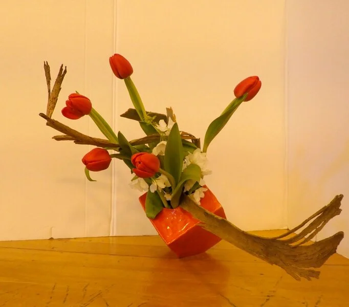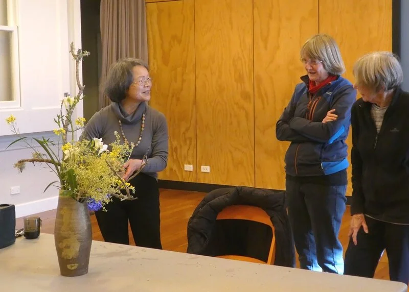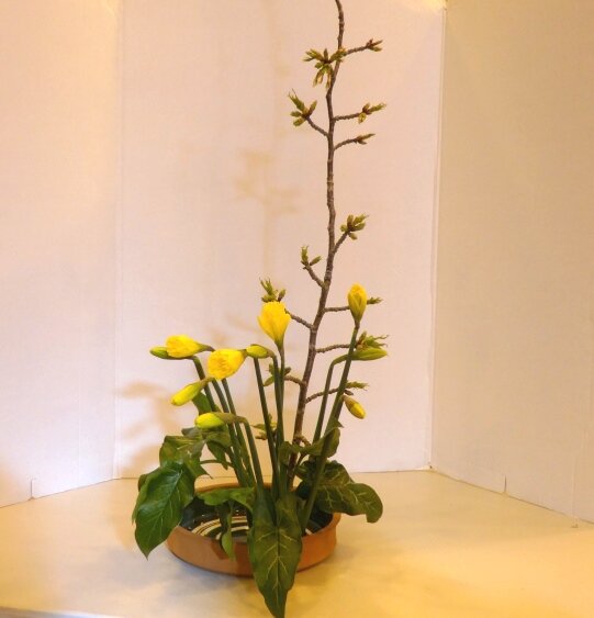 Our Sogetsu group met in the Khandallah Town Hall on Sunday, 13th September at 2 - 4pm. Sandi prepared 4 arrangements for us to demonstrate how to arrange ‘Spring flowers or blossoms’ in various containers. She suggested we follow lessons from the Sogetsu textbooks: