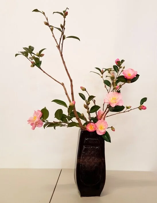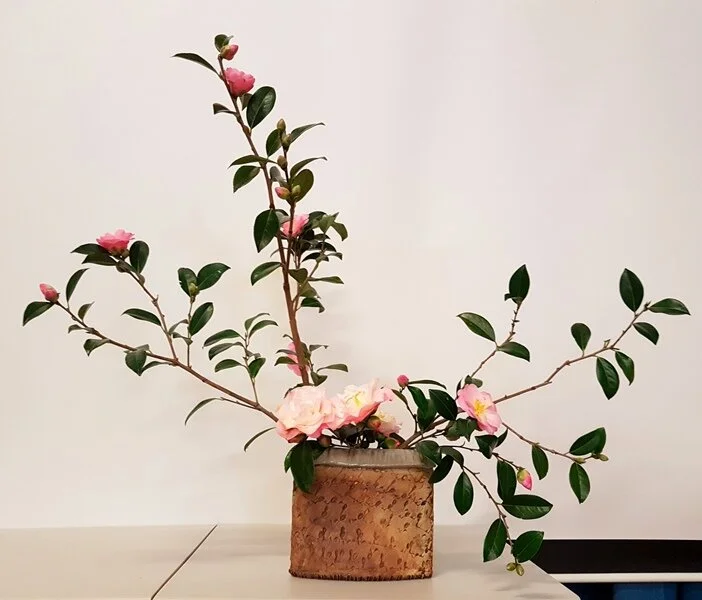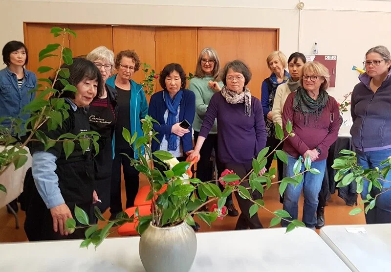 There were 14 of our Sogetsu members who attended. In the afternoon workshop we all enjoyed learning how to arrange camellias using a split drop-stick to secure strong branches in the squat/vertical container.